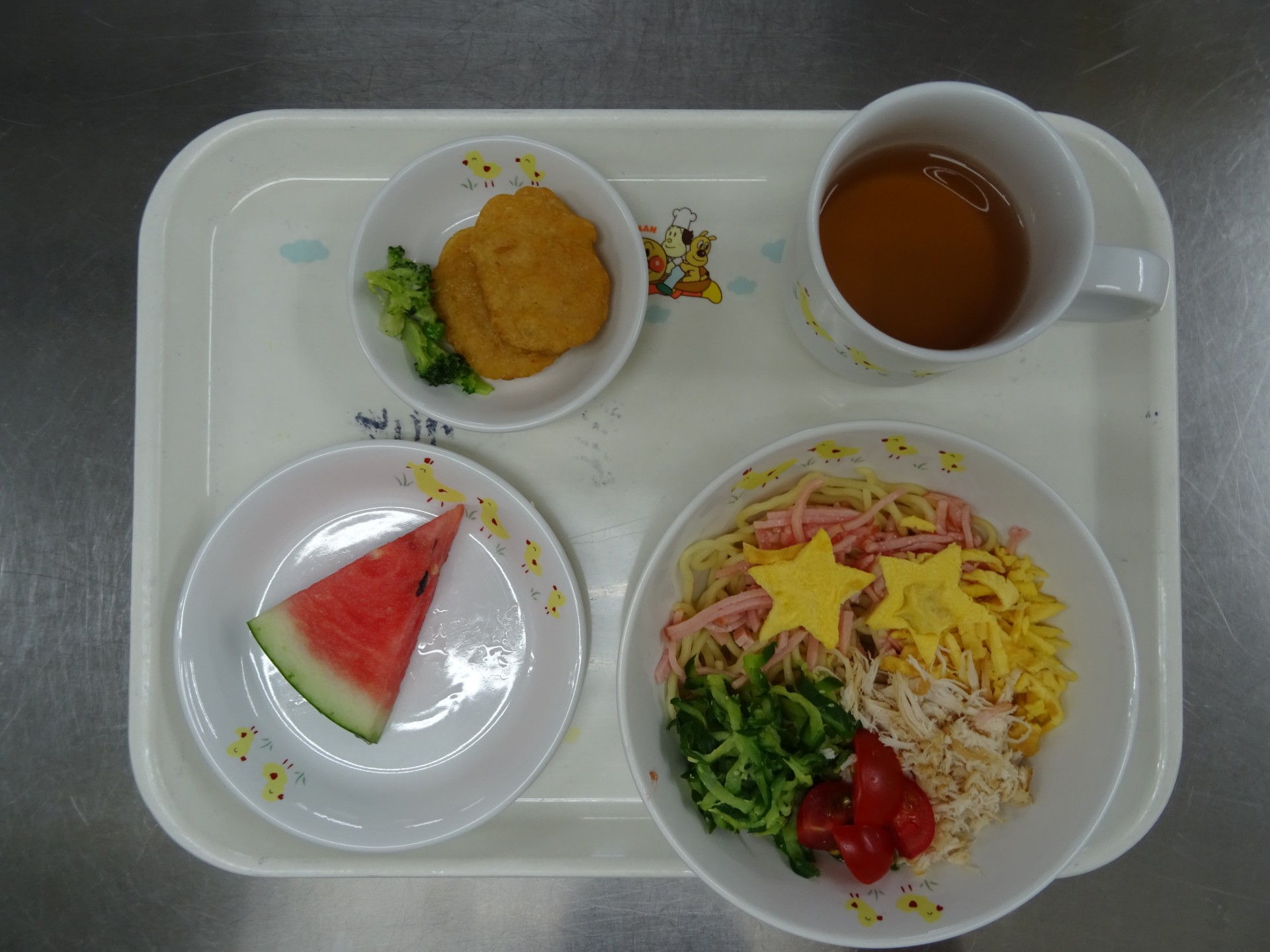 天の川冷やし中華、チキンナゲット、すいか