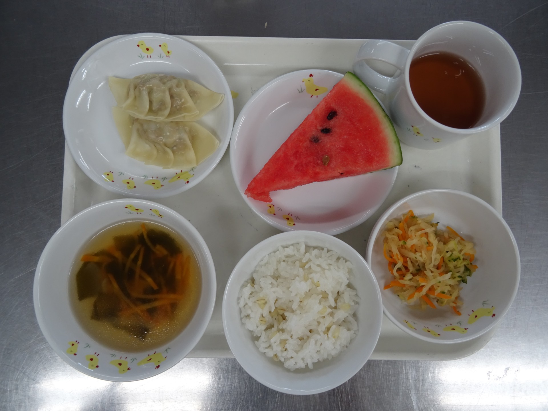 2023年8月30日 / 最終更新日時 : 2023年8月30日 民生博愛会 給食とおやつのブログ 8月 食育メニュー 8月18日 食育メニュー 大野保育園 麦ごはん、根菜ギョウザ、カミカミサラダ、わかめスープ、スイカ
