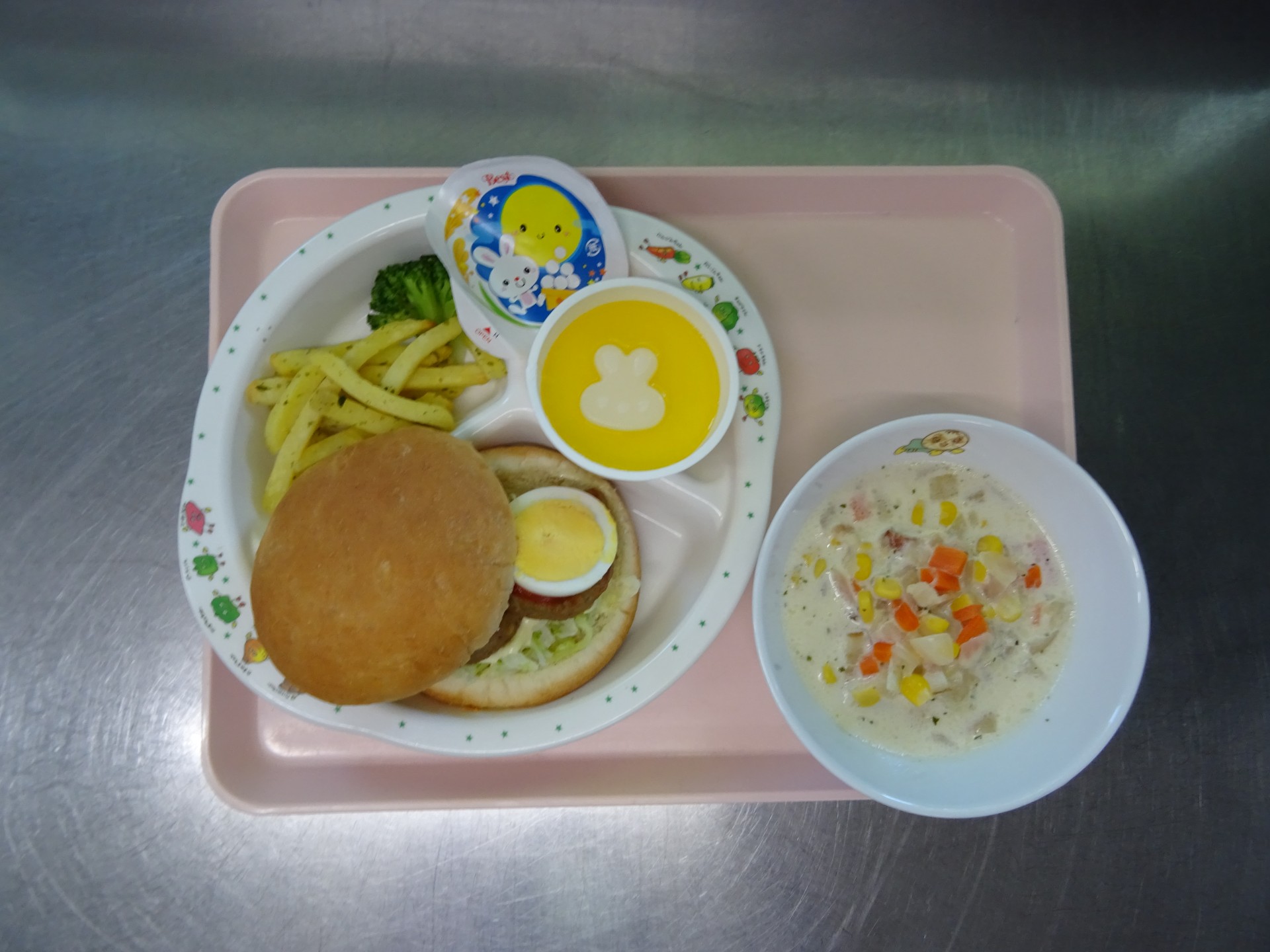 2023年10月18日 / 最終更新日時 : 2023年10月18日 民生博愛会 給食とおやつのブログ 9月 行事メニュー 9月22日 行事メニュー(十五夜) 第四東光保育園 お月見バーガー、フライドポテト、つぶつぶコーンのミルクスープ、十五夜デザート