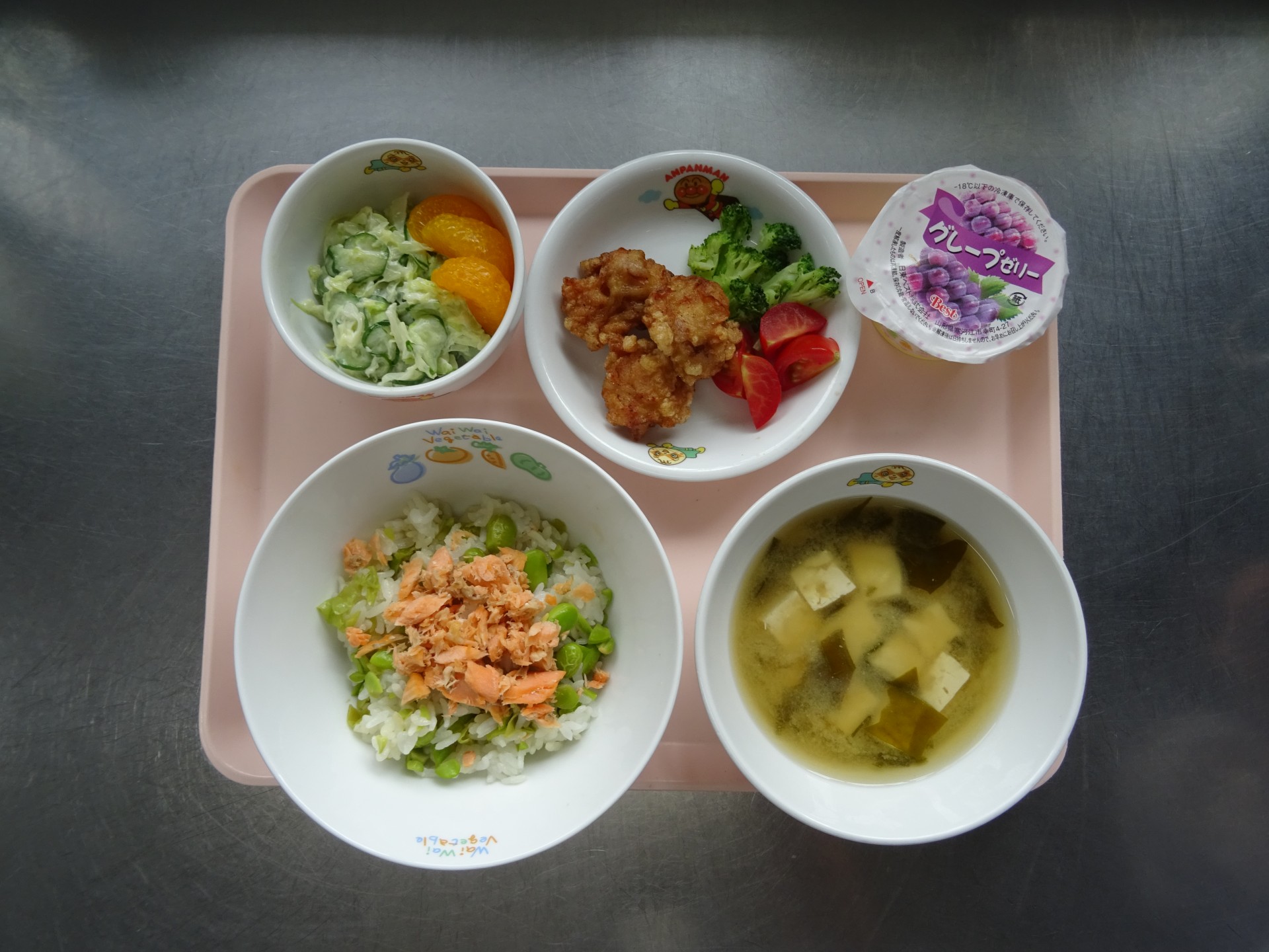 2023年10月18日 / 最終更新日時 : 2023年10月18日 民生博愛会 給食とおやつのブログ 9月 お楽しみメニュー 9月25日 お楽しみメニュー 第四東光保育園 鮭と枝豆の混ぜご飯、みそ汁(豆腐とわかめ)、から揚げ、野菜サラダ、グレープゼリー
