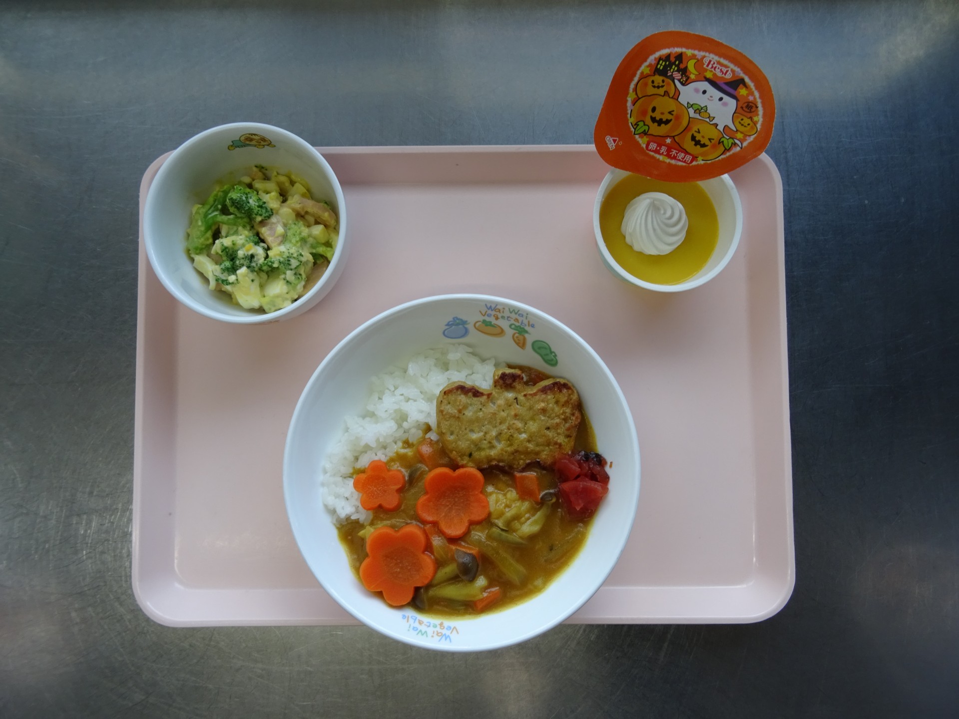 2023年11月17日 / 最終更新日時 : 2023年11月17日 民生博愛会 給食とおやつのブログ 10月 行事メニュー 10月31日(火) ハロウィンメニュー 第四東光保育園 ハロウィンカレーライス、ブロッコリーと卵のサラダ、パンプキンババロア ハロウィンケーキ、牛乳
