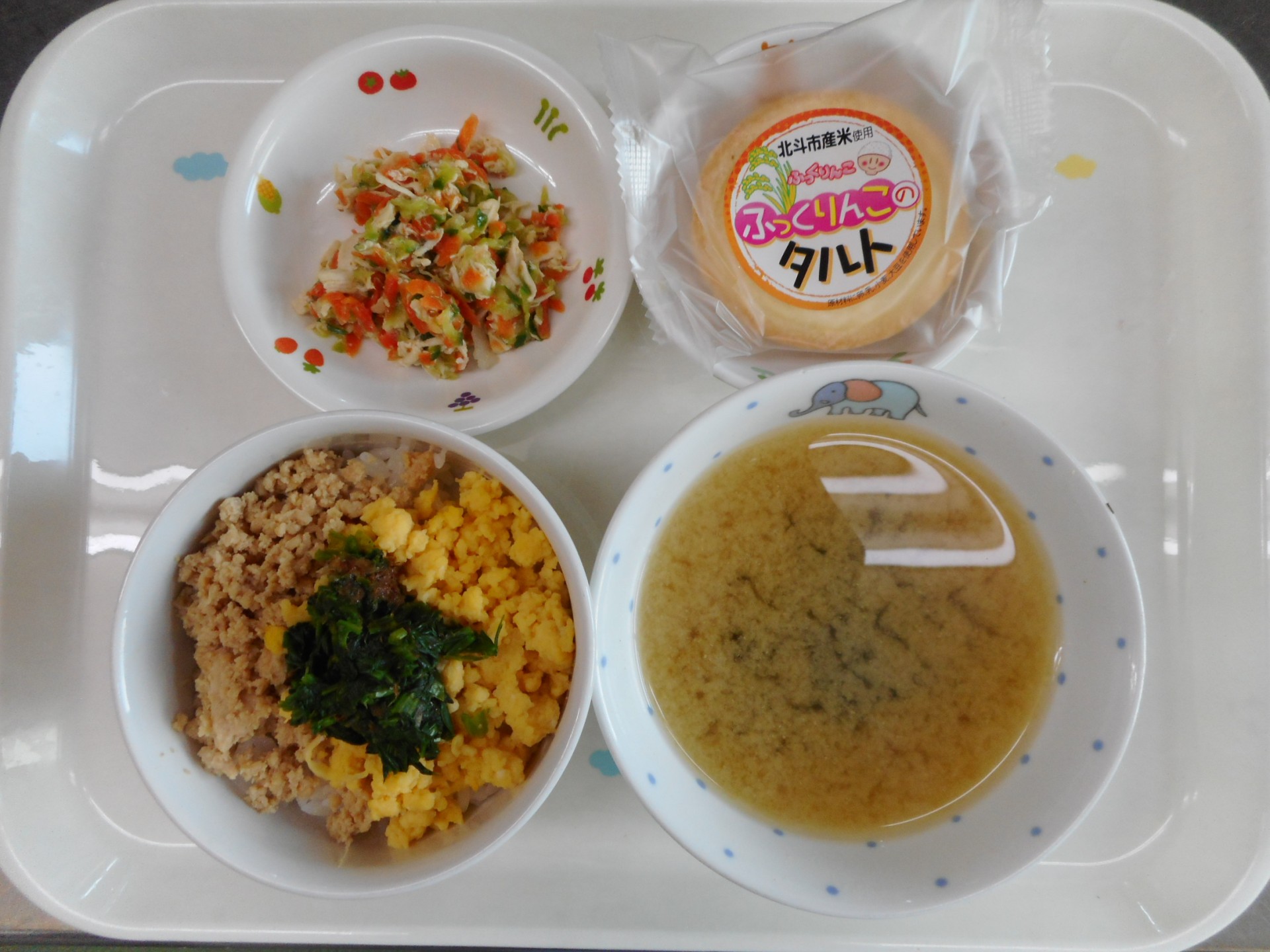 2024年1月4日 / 最終更新日時 : 2024年1月4日 民生博愛会 給食とおやつのブログ 12月 お楽しみメニュー 12月26日(火) お楽しみメニュー 第三東光保育園 三食ごはん、みそ汁(わかめとえのき)、ゆで鶏の和風だれ和え、ふっくりんこのタルト