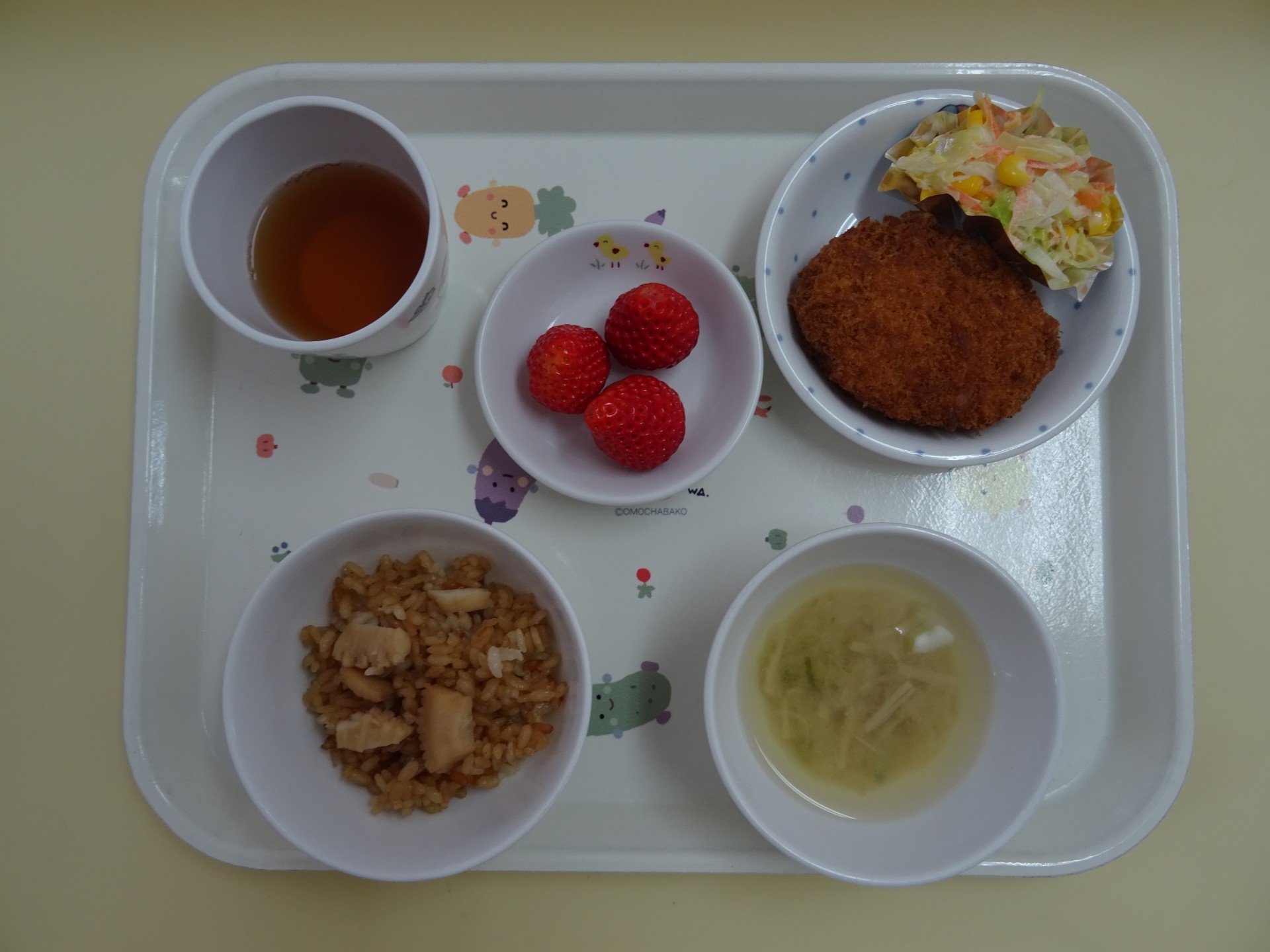 2024年4月17日 / 最終更新日時 : 2024年4月17日 民生博愛会 給食とおやつのブログ 3月 食育メニュー 3月22日(金) 食育メニュー 東光保育園 いかめしの混ぜご飯、みそ汁(豆腐とえのき)、かぼちゃコロッケ、コールスローサラダ、イチゴ