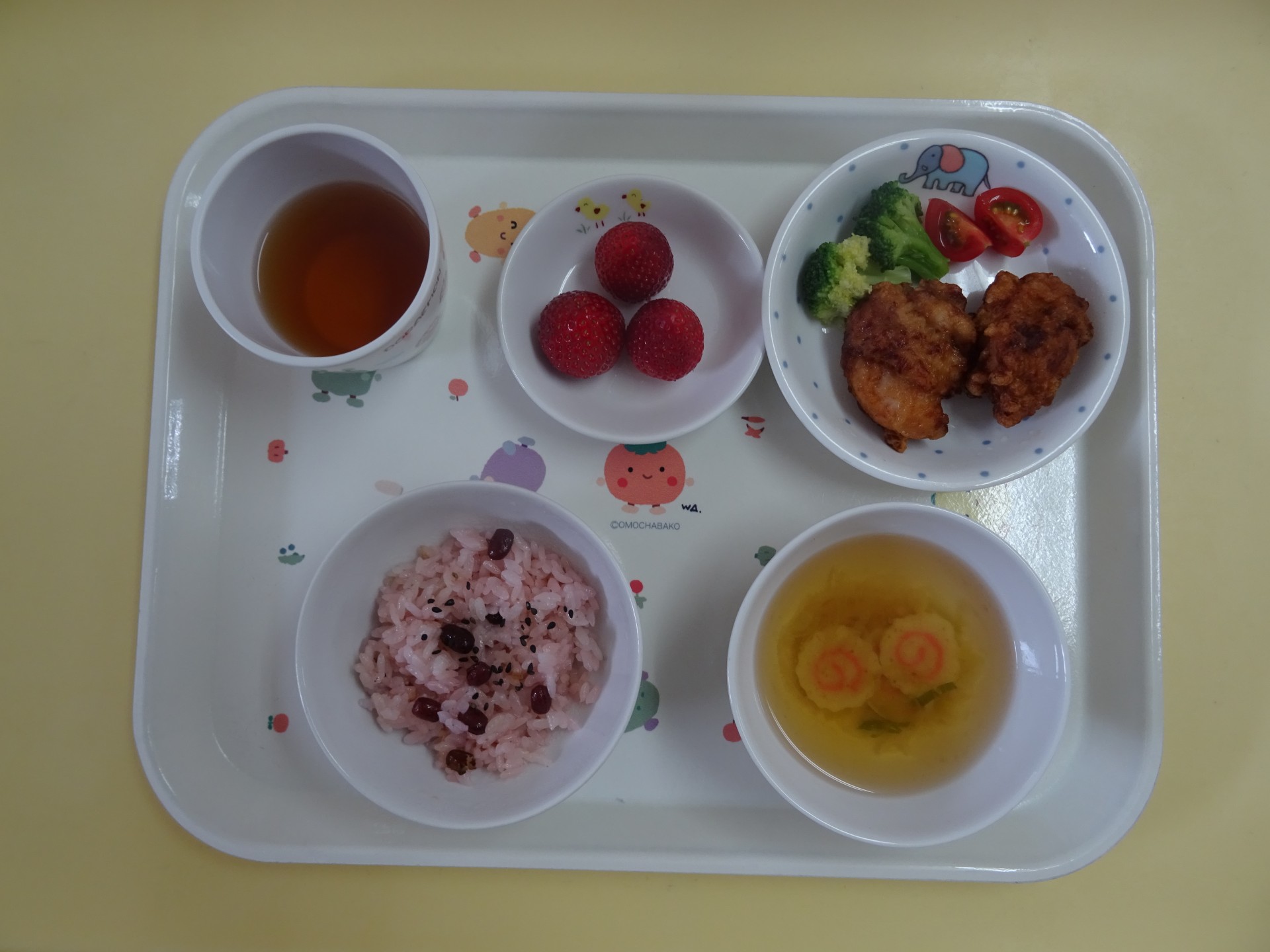 2024年5月23日 / 最終更新日時 : 2024年5月23日 民生博愛会 給食とおやつのブログ 4月 行事メニュー 4月11日(木) 行事メニュー 東光保育園 赤飯、すまし汁(なるととねぎ)、鶏肉の竜田揚げ、イチゴ