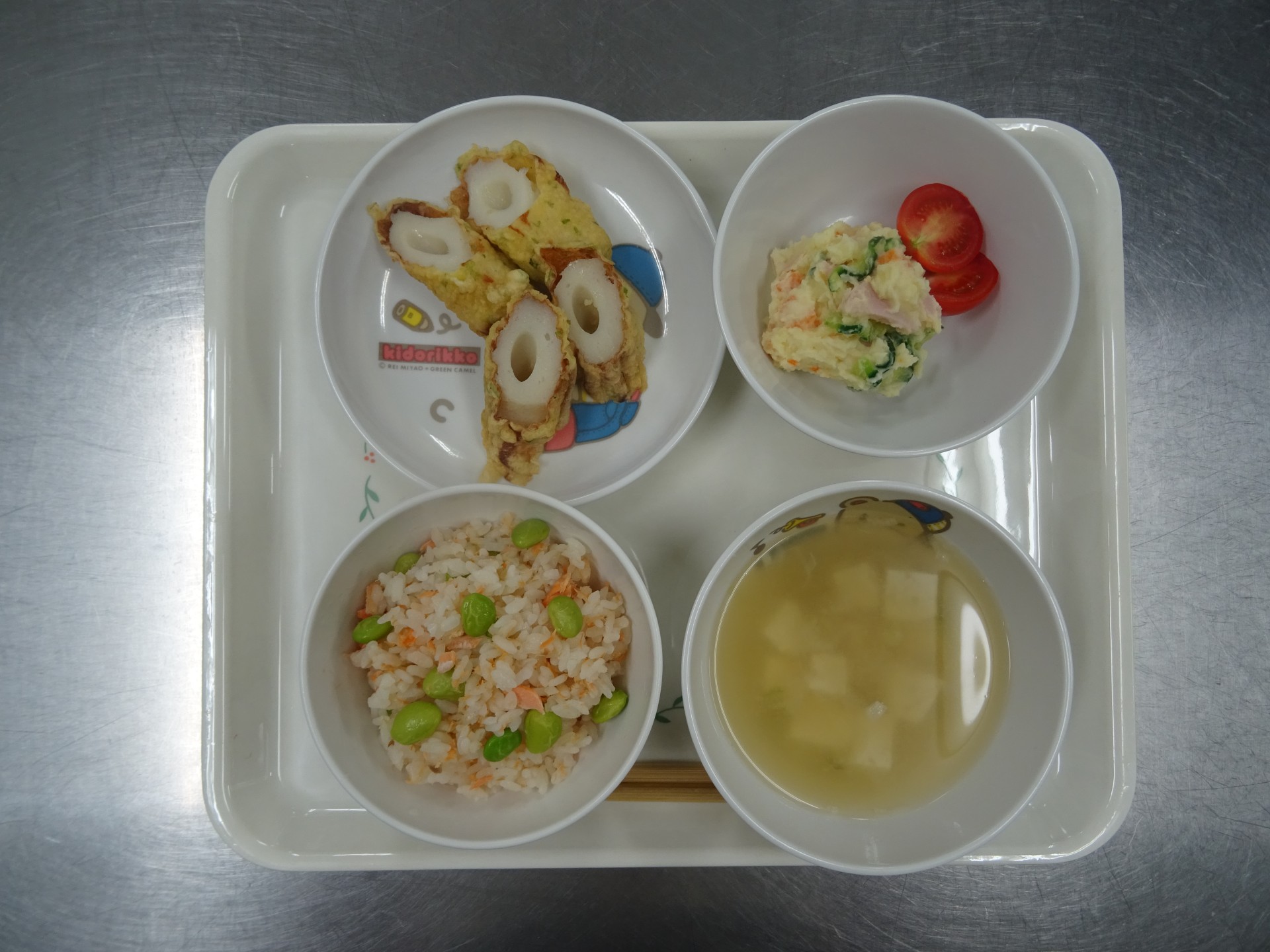 2024年8月1日 / 最終更新日時 : 2024年8月1日 民生博愛会 給食とおやつのブログ 7月 食育メニュー 7月19日(金) 第二東光保育園 食育メニュー 鮭と枝豆のまぜごはん、みそ汁(ねぎと豆腐)、ちくわのいそべ揚げ、ポテトサラダ