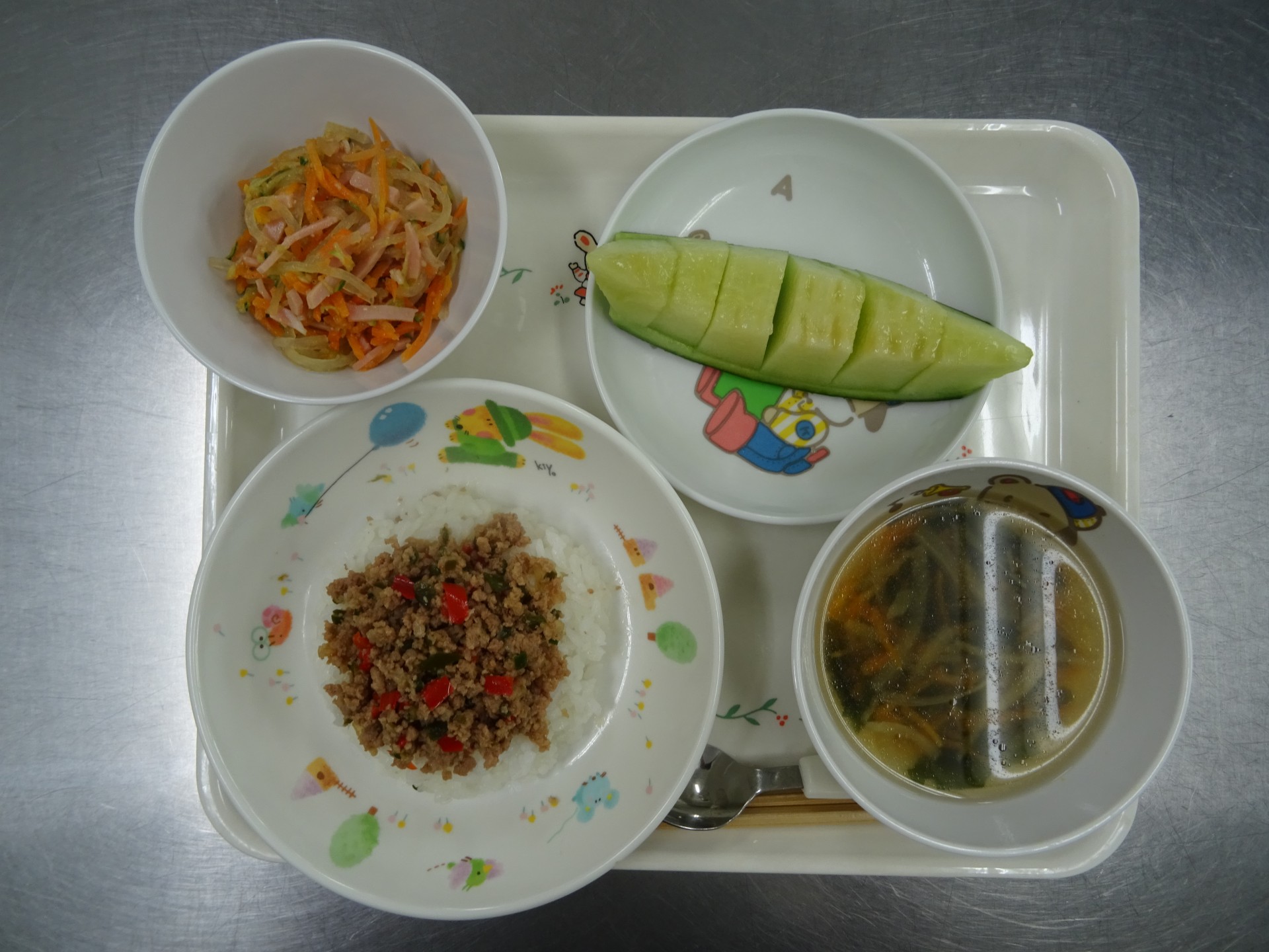2024年8月1日 / 最終更新日時 : 2024年8月1日 民生博愛会 給食とおやつのブログ 7月 お楽しみメニュー 7月25日(木) 第二東光保育園 お楽しみメニュー ガパオライス、わかめスープ、春雨サラダ、メロン