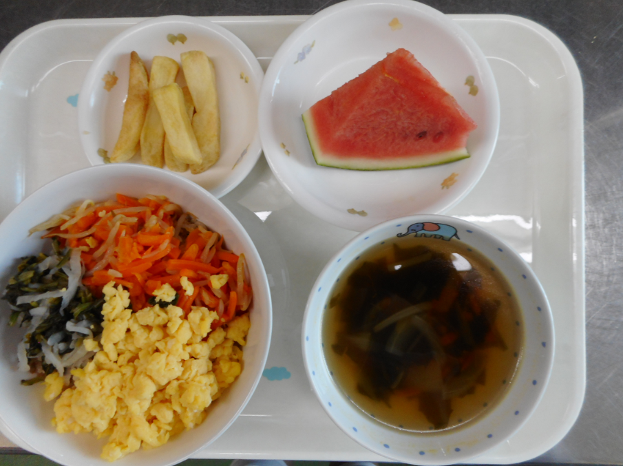 2024年9月17日 / 最終更新日時 : 2024年9月17日 民生博愛会 給食とおやつのブログ 8月 お楽しみメニュー 8月23日(金) 第三東光保育園 お楽しみメニュー 野菜たっぷりビビンバ、わかめスープ、フライドポテト、すいか