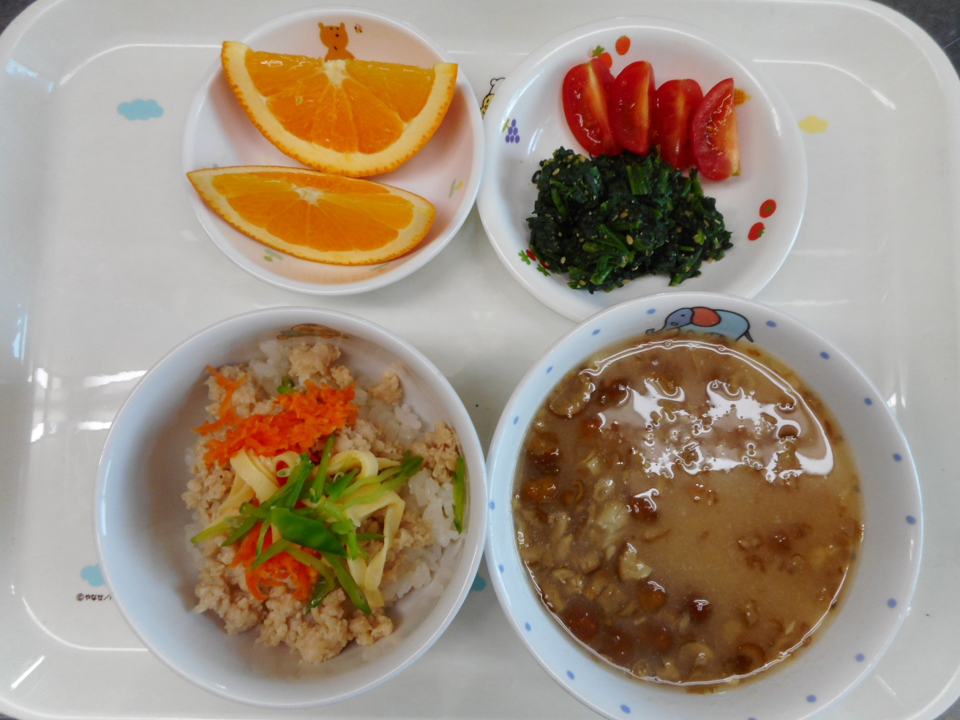2024年11月20日 / 最終更新日時 : 2024年11月20日 民生博愛会 給食とおやつのブログ 9月 お楽しみメニュー 9月30日(月) お楽しみメニュー 第三東光保育園 鶏そぼろ丼、みそ汁(なめこと大根)、ほうれん草の胡麻和え、オレンジ