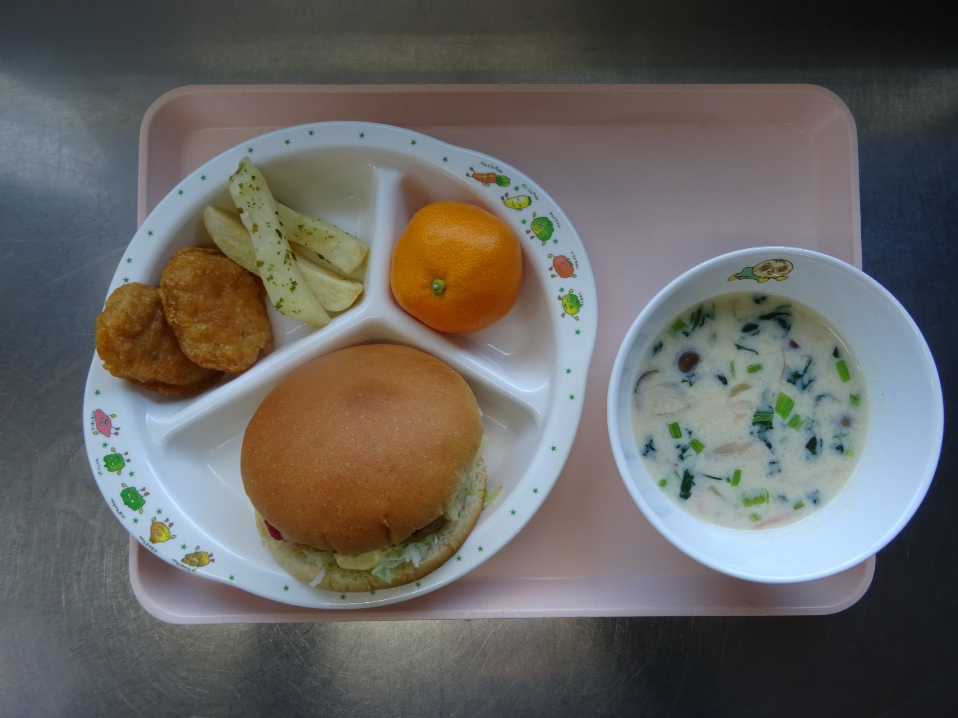 2024年11月25日 / 最終更新日時 : 2024年11月25日 民生博愛会 給食とおやつのブログ 11月 お楽しみメニュー 11月25日(月) お楽しみメニュー 第四東光保育園 チーズバーガー、具だくさん豆乳スープ、ポテト、チキンナゲット、みかん