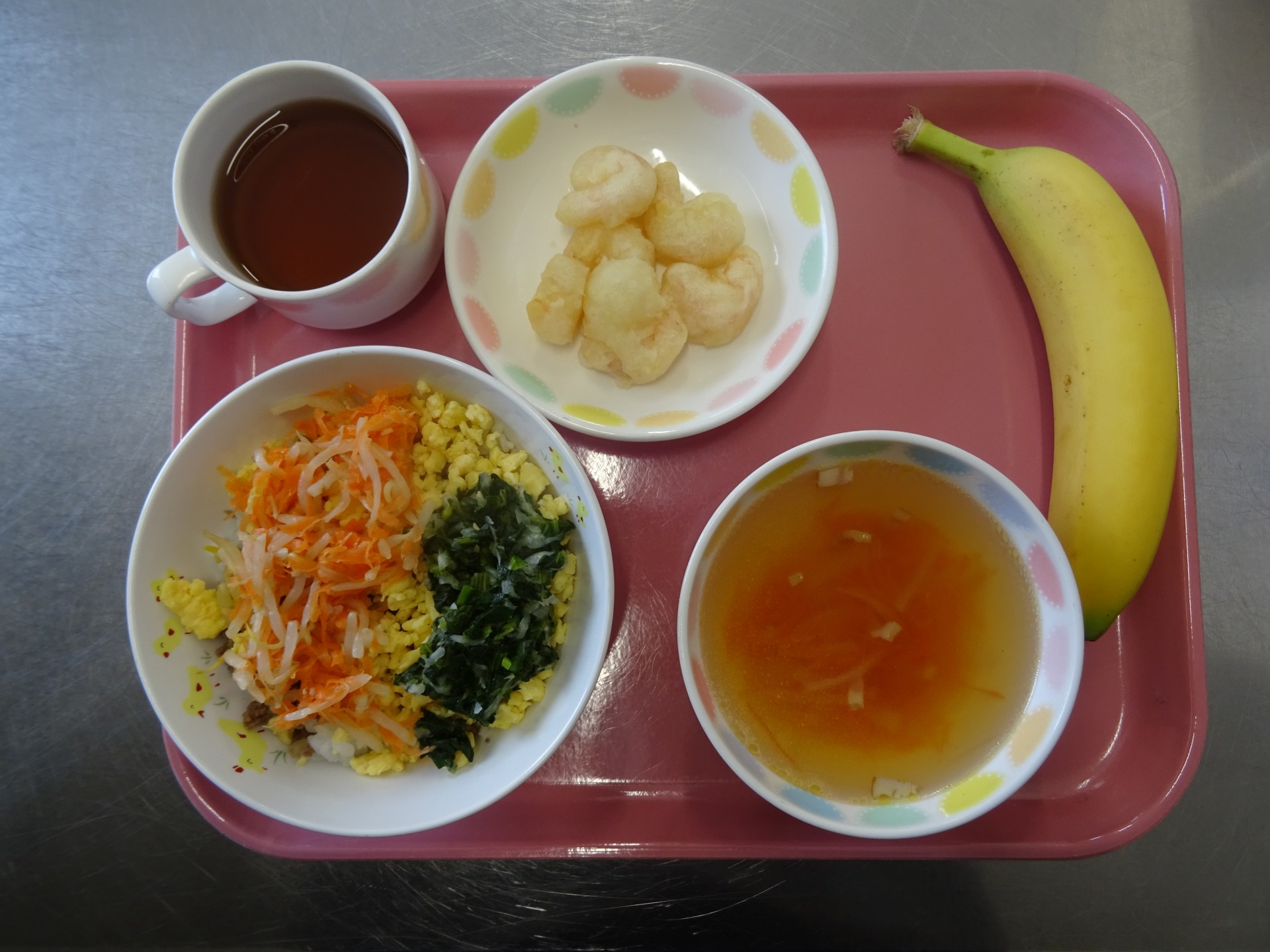 2025年3月3日 / 最終更新日時 : 2025年3月3日 民生博愛会 給食とおやつのブログ 2月 食育メニュー 2月19日(水) 食育メニュー 第二大野保育園 野菜たっぷりビビンバ、ベーコンスープ、エビフリッター、バナナ