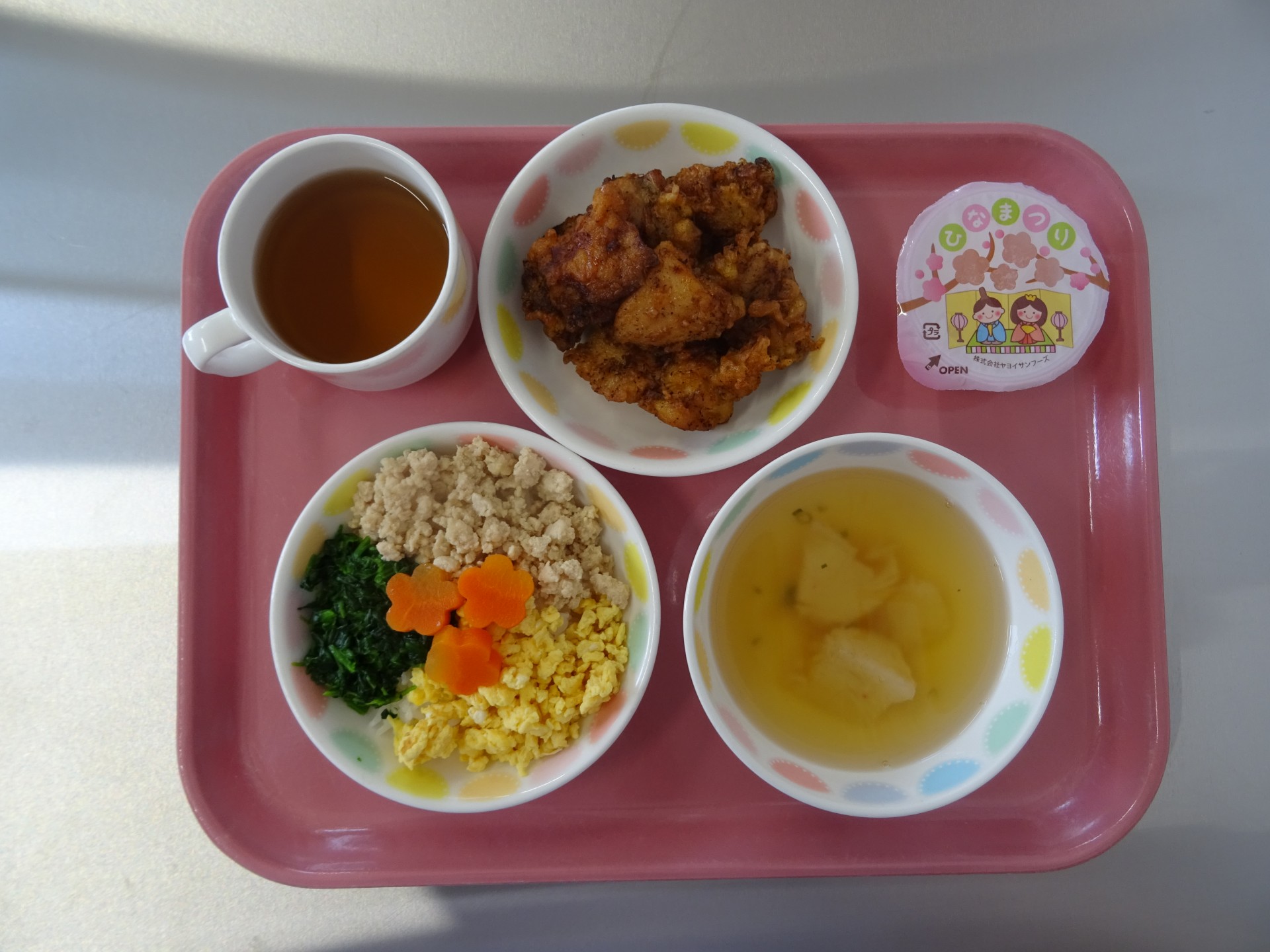 2025年3月26日 / 最終更新日時 : 2025年3月26日 民生博愛会 給食とおやつのブログ 3月 行事メニュー 3月3日(月) 第二大野保育園 行事メニュー 三色丼、すり身汁、鶏肉のから揚げ、ひな祭りゼリー