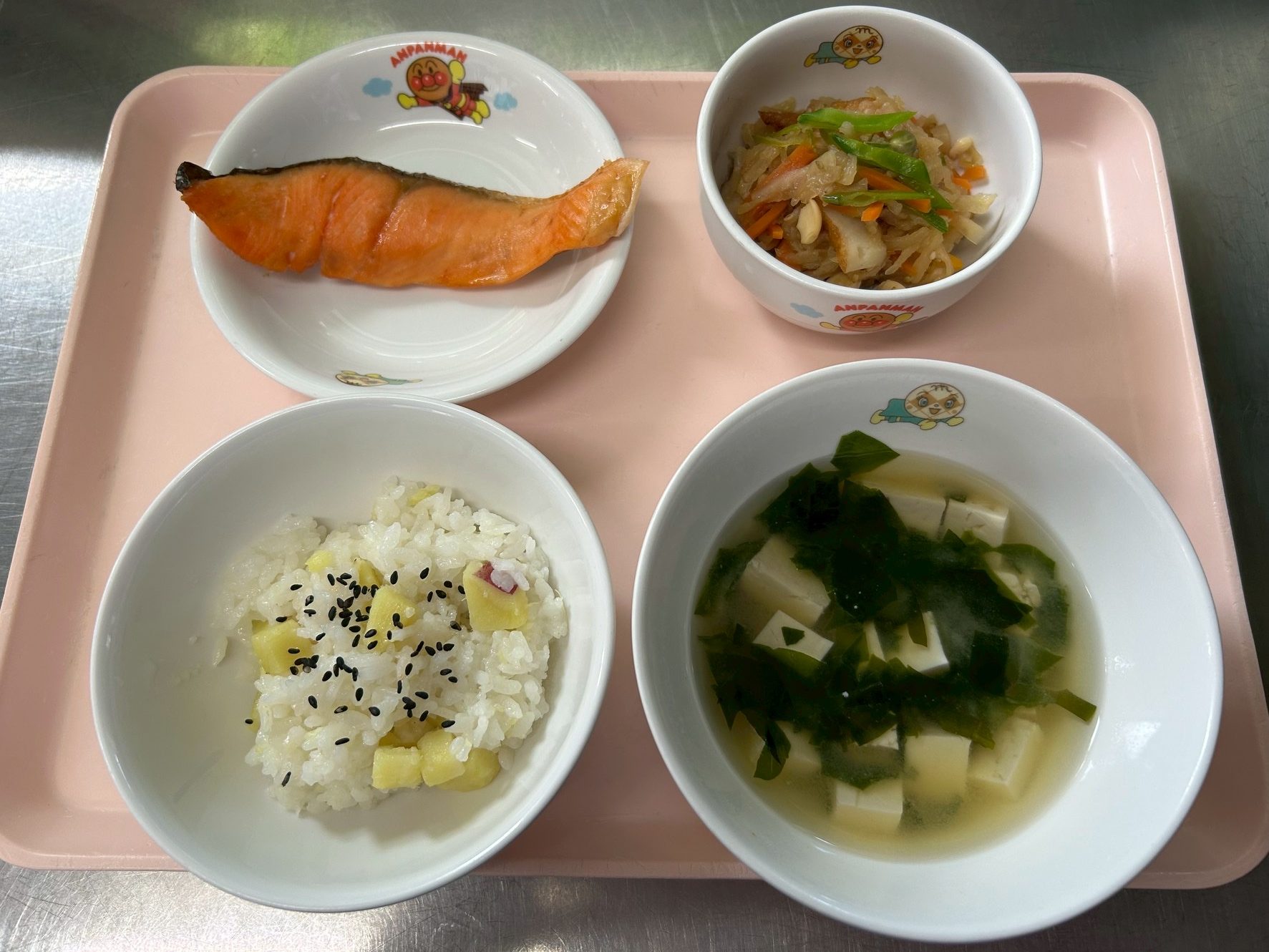 2025年10月30日 / 最終更新日時 : 2025年10月30日 民生博愛会 給食とおやつのブログ 10月 食育メニュー 10月17日(金) 食育メニュー 第四東光保育園 サツマイモごはん、みそ汁(豆腐とわかめ)、鮭の塩焼き、切干大根の煮物