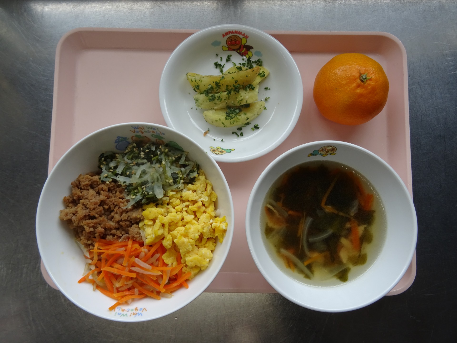 2025年11月25日 / 最終更新日時 : 2025年11月25日 民生博愛会 給食とおやつのブログ 11月 お楽しみメニュー 11月25日(火) お楽しみメニュー 第四東光保育園 野菜たっぷりビビンバ、わかめスープ、フライドポテト、みかん