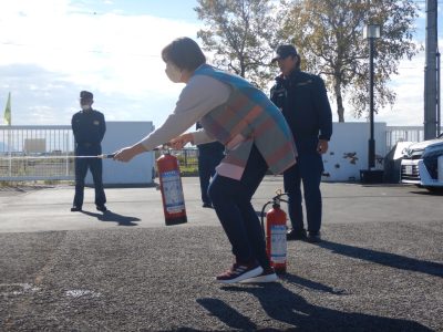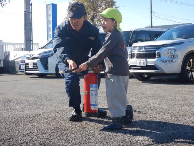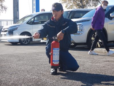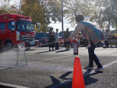 訓練後は、水が入った消火器を使用しての消火訓練を見学しました。