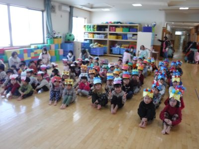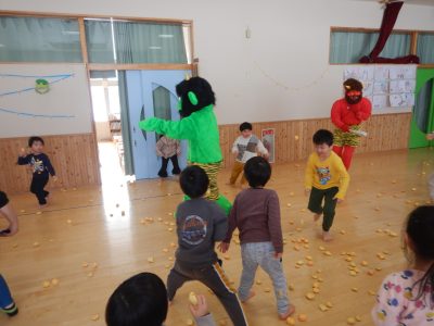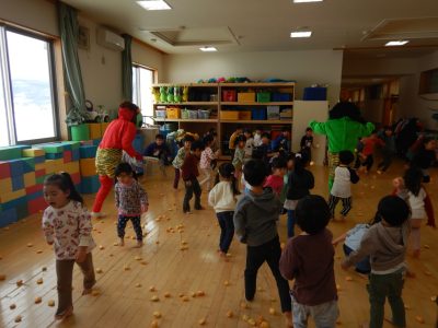 お遊戯室に豆まきをする時は、子ども達全員で大きな声で「おにはそと!ふくはうち!」と豆をまく事が出来ましたよ!