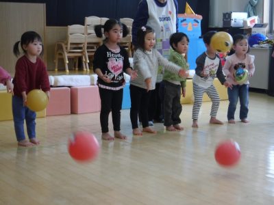 ひよこ組とあひる組は、鬼のペットボトルをボールで倒してゴール!