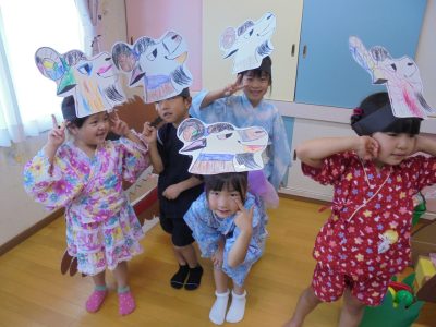 手作りのお面をかぶって準備万端!
