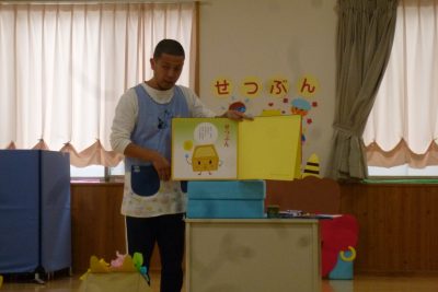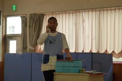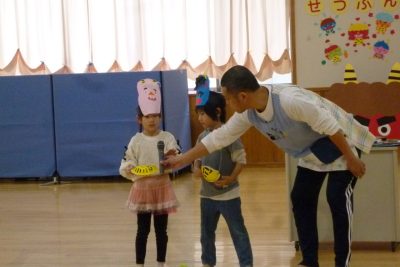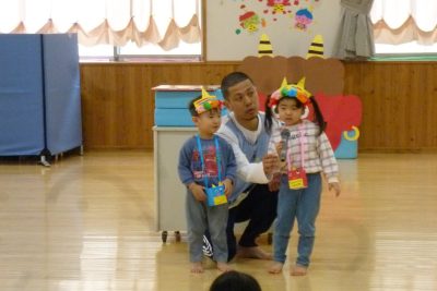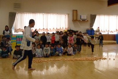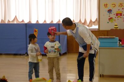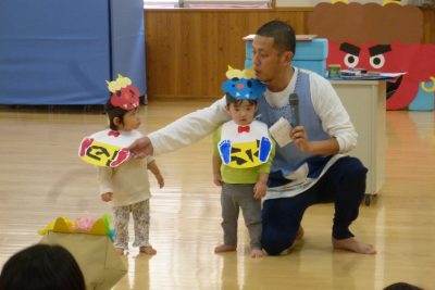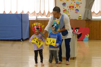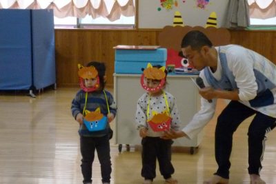 まずはクラスの代表さんがお面や豆入れを紹介。