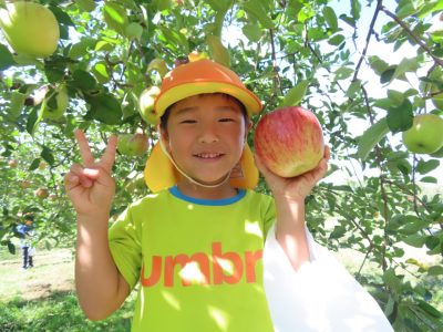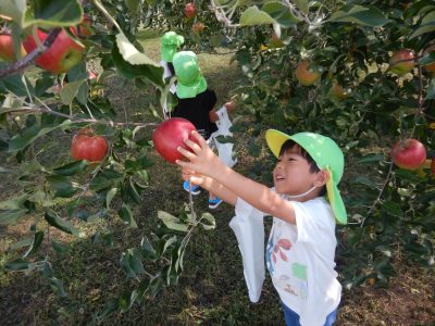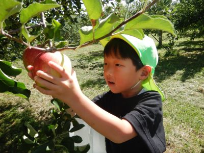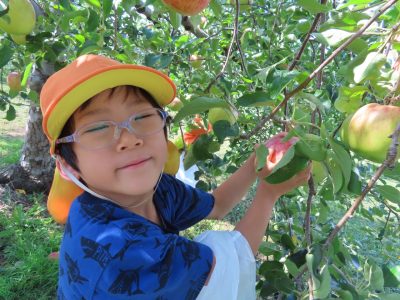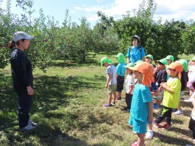 果樹園に到着!採り方などをしっかり聞いてから、みんなでりんご狩りスタート!