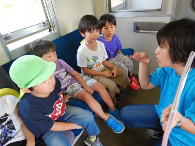 汽車の中では、窓から見える函館山や色々な景色、駅やいさりび鉄道などにちなんだクイズを楽しみました。