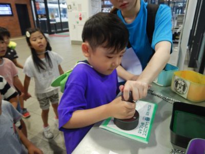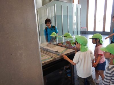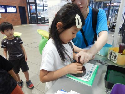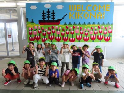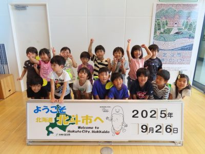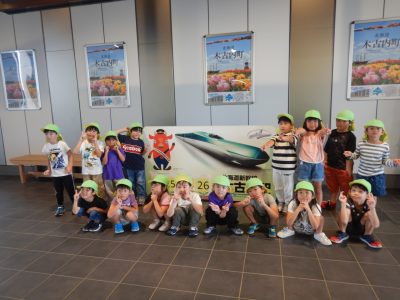新函館北斗駅では記念スタンプを押したり、駅の中を見学し、1階のイベントスペースでは北斗市の歌「赤とんぼ」を歌いました。