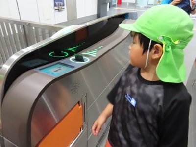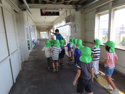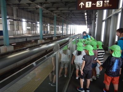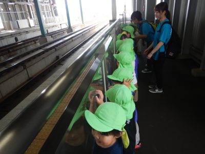 新幹線の駅のホームでは、どっちから新幹線が来るのかな?線路が大きいねなど興味津々の子どもたち。