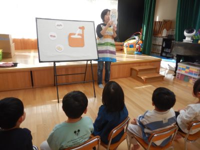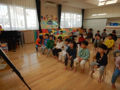 初めにみんなでお遊戯室に集まり、お餅はどうやってできるのか?何故お正月にお餅を飾るのか? などの話を聞きました。みんな真剣です。