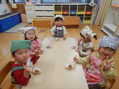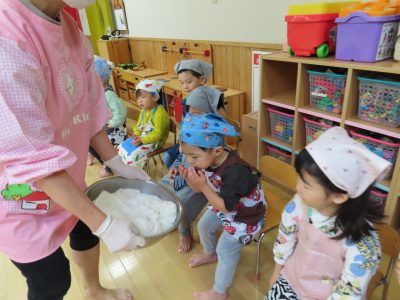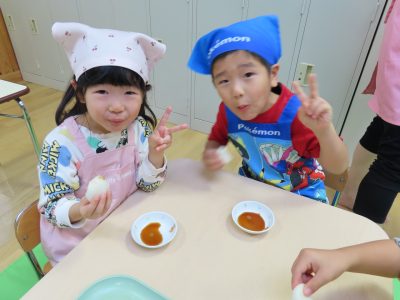 お餅をついた後は、砂糖醬油を付けみんなでおいしくいただきました。「つきたてのおもちはふわふわやわらかくて、とってもおいしい~」「まだまだ食べたい!」と大人気でした。