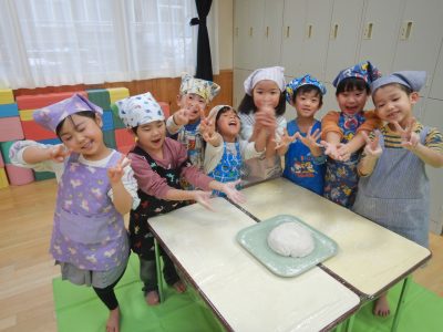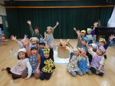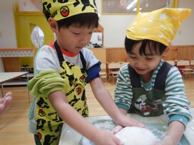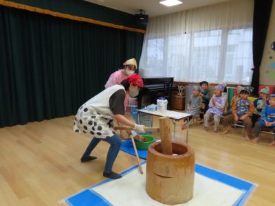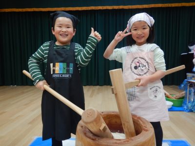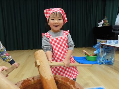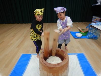 年長組のみんなは力を合わせて立派な鏡餅を作ってくれました。お正月の準備もバッチリです。貴重な経験が出来、楽しいおもちつき会になりました!