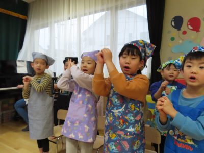 みんなでお餅つきの歌を元気に歌い終わると、蒸したもち米が運ばれてきます。「お米のいいにおいがする」とにおいを嗅いで気持ちも高まります。