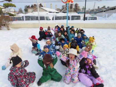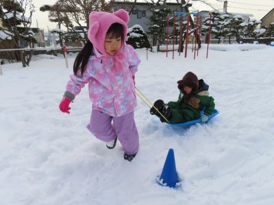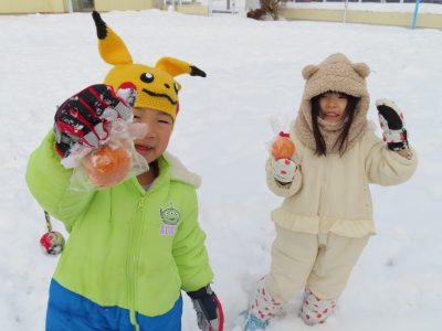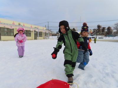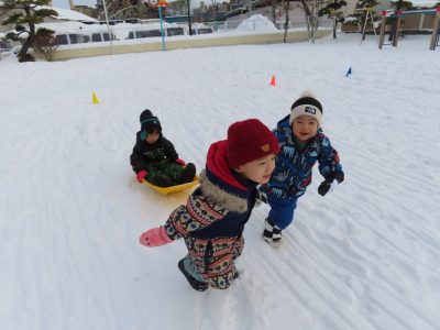 園庭に雪がたくさん積もったのでぺんぎん・いるか・くじら組で運動会をしました!
