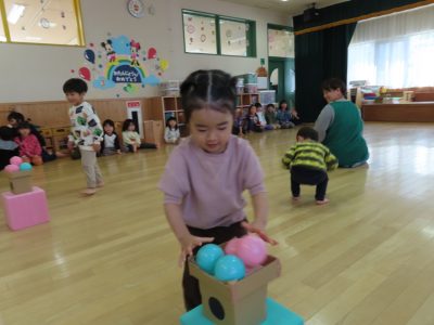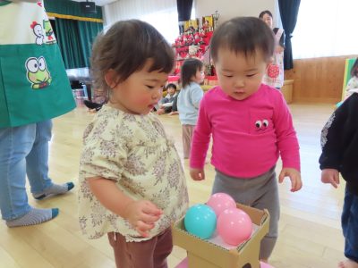 小さいクラスはゲームでひなあられをおひなさまに運びました!