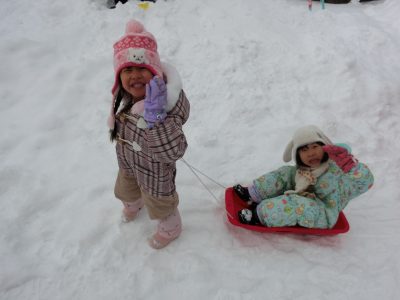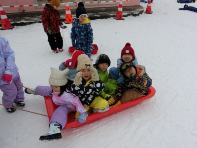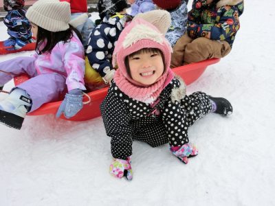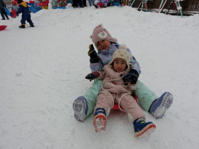 小さい子と一緒にそり滑り!上手く滑れたよ♪