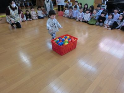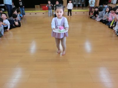 最後はひし餅運びリレー!腕をしっかりと伸ばして運ぶよ!
